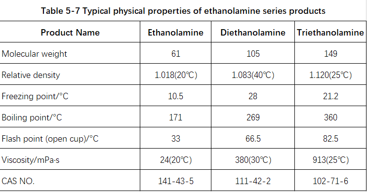 Compounds containing both hydroxyl and primary amino (or secondary amino) groups, and polyols containing tertiary nitrogen atoms, can all be used as polyurethane crosslinkers. The tertiary amino group also has a certain catalytic effect on the reaction between isocyanates and polyols. Commonly used alkanolamine crosslinkers include diethanolamine, triethanolamine, ethanolamine, and bis-2-(hydroxypropyl)aniline. Table 5-7 shows the typical physical properties of ethanolamine series products.