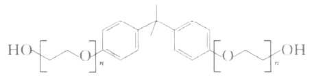 Hangzhou Bailang Additives Co., Ltd.’s toughening resin A-206 is bisphenol A polyoxyethylene ether (BPA+6EO), a colorless to light yellow transparent liquid with a hydroxyl value of 220-230 mg KOH/g, an acid value of ≤0.1 mg KOH/g, and potassium and sodium ions ≤15 mg/kg. Guodu Chemical (Kunshan) Co., Ltd.’s BP-11 is a polyether initiated with bisphenol A, with a hydroxyl value of 280-300 mg KOH/g, a viscosity of 800-2200 (60℃), a color of ≤100, and an acid value of ≤0.2 mg KOH/g. Jiangsu Hai’an Petrochemical Plant and Shenyang Purixing Fine Chemical Co., Ltd. also produce bisphenol A polyoxyethylene ether.