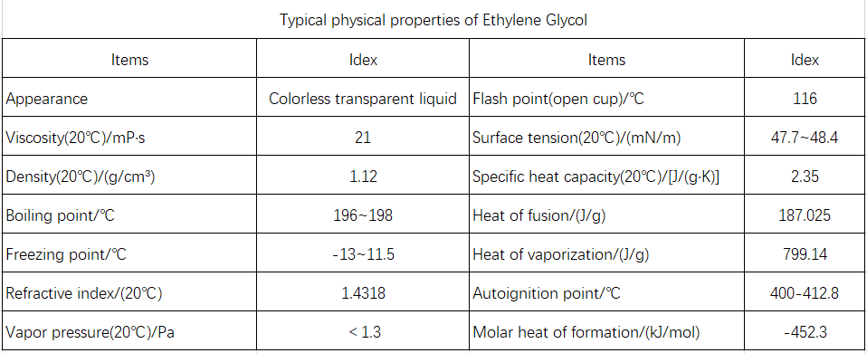 A colorless, transparent, viscous liquid with a sweet taste, hygroscopic, and flammable. Explosion limits: 3.2%–15.3% (volume fraction). Ethylene glycol is miscible with water, lower aliphatic alcohols, glycerol, acetic acid, ketones, aldehydes, and pyridine; slightly soluble in diethyl ether; and almost insoluble in benzene and its homologs, chlorinated hydrocarbons, petroleum ether, and oils. It significantly lowers the freezing point of water. Typical physicochemical properties of ethylene glycol are shown in Table 5-13.