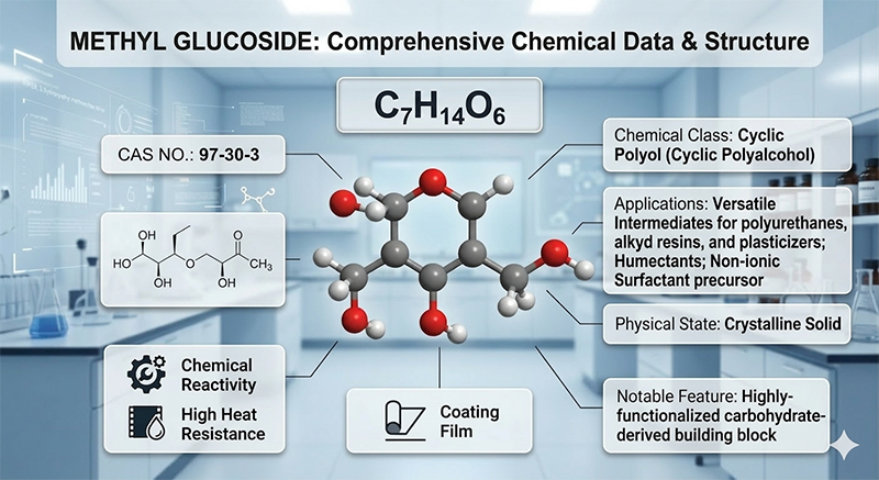 Methyl glucoside is a tetrahydroxy polyol featuring a cyclic structure. It serves as an initiator for polyether polyols used in rigid polyurethane foams and can also be utilized in small quantities for the synthesis of polyester polyols. It is employed as a raw material for non-ionic surfactants in daily chemical products and finds application in the pharmaceutical industry. Furthermore, it acts as a modifier for thermosetting urea-formaldehyde and phenol-formaldehyde resins, and is utilized in various industrial sectors such as textile finishing, adhesives, coatings, and cosmetics.