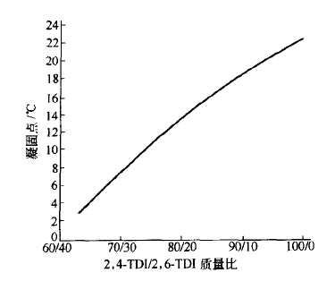 The ratio of 2,4- and 2,6-isomers in TDI affects its physical properties, such as freezing point and viscosity. As the content of the 2,4-isomer increases, the freezing point of the TDI product increases, as shown in Figure 1-1.