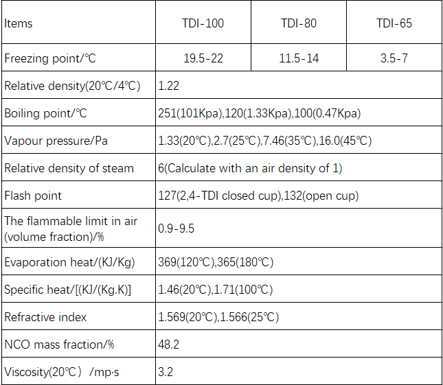 The melting point (freezing point) of 2,4-TDI is approximately 21℃, the boiling point is 252-254℃, and the boiling point measured by the DCS method is approximately 249℃. The relative density (25℃) is 1.214. The melting point (freezing point) of 2,6-TDI is 8-10.5℃, the boiling point is 247-249℃, the boiling point measured by the DSC method is 244℃, the boiling point under reduced pressure is 130℃/2.4 kPa, 96℃/200 Pa, and the relative density (20℃) is 1.226.
